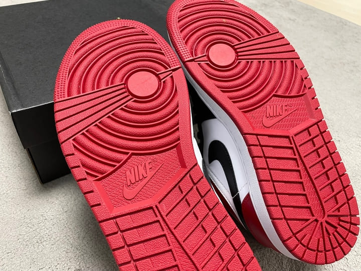 조던 1의 모델의 경우 레드와 블랙 화이트의 조합은 항상 불패의 조합이기도 합니다. 아웃솔은 바시티 레드 컬러로 덮여있으며, 설포(텅)에는 조던의 점프맨 로고가 자수처리되었습니다. 전체적인 쉐잎은 OG 쉐잎은 아닌 걸로 보입니다.