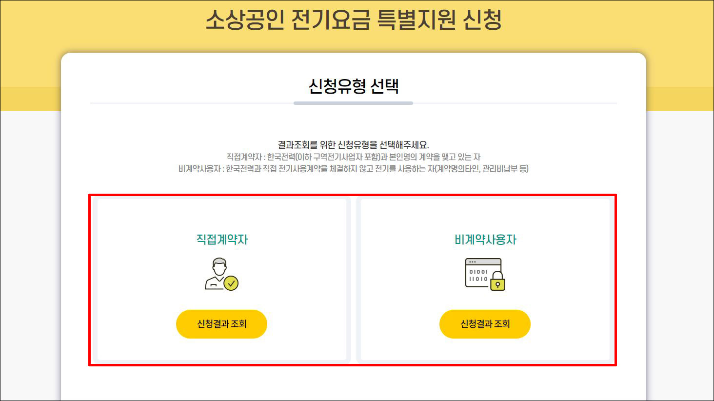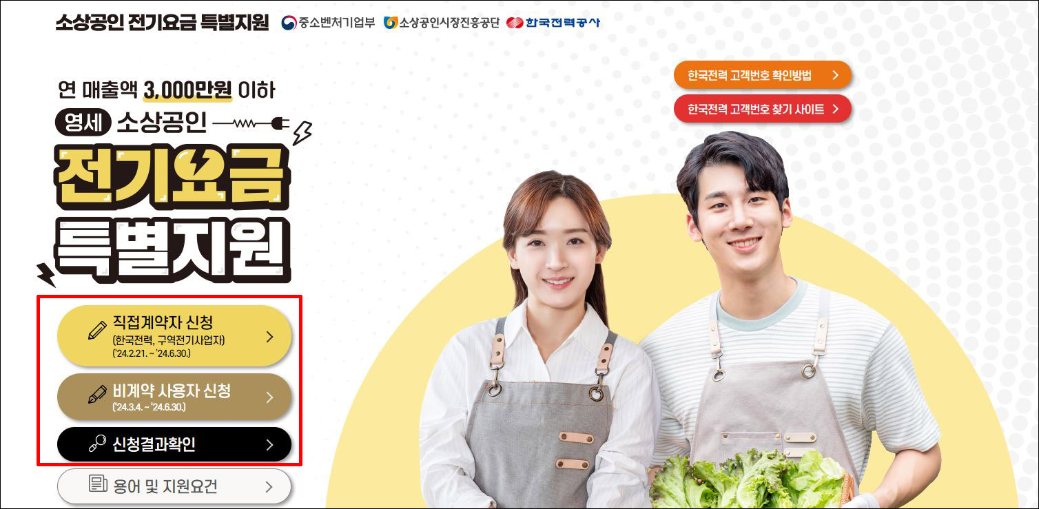 신청은 직접계약자와 비계약 사용자로 구분되어 신청할 수 있습니다. 이는 각각의 신청 방법과 절차가 존재하며, <소상공인전기요금특별지원 kr> 홈페이지에서 직접계약자와, 비계약 사용자가 따로 신청이 가능합니다.
