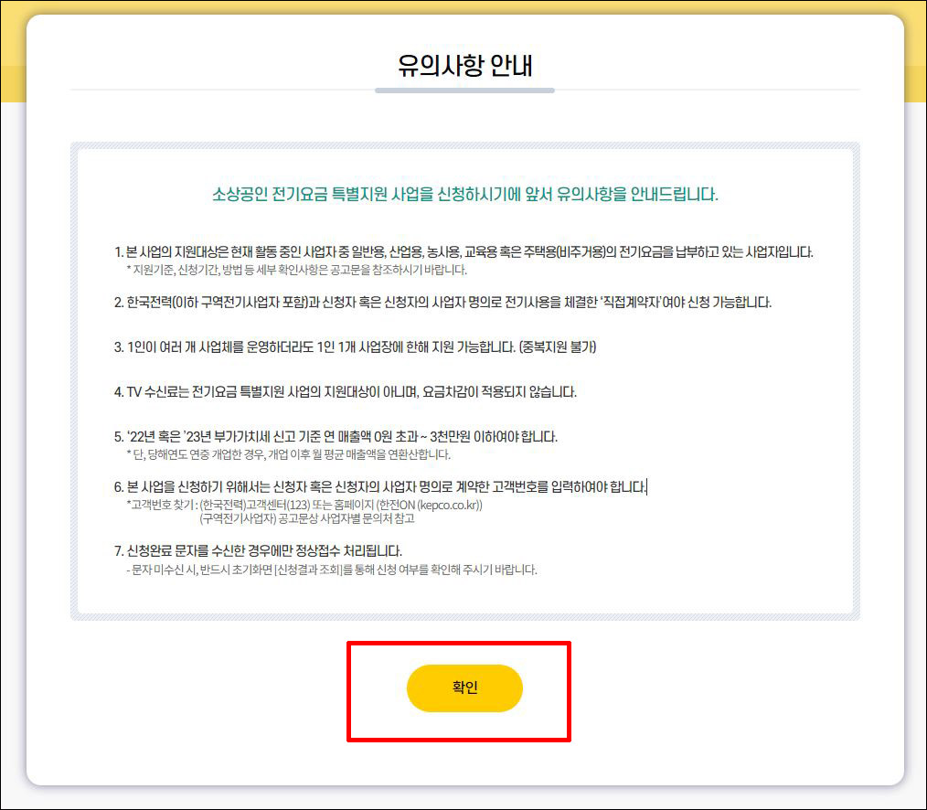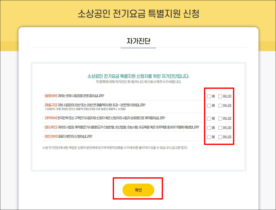 ④ 소상공인 전기요금 특별지원 신청 대상 자가진단 체크 → 하단 <확인> 클릭