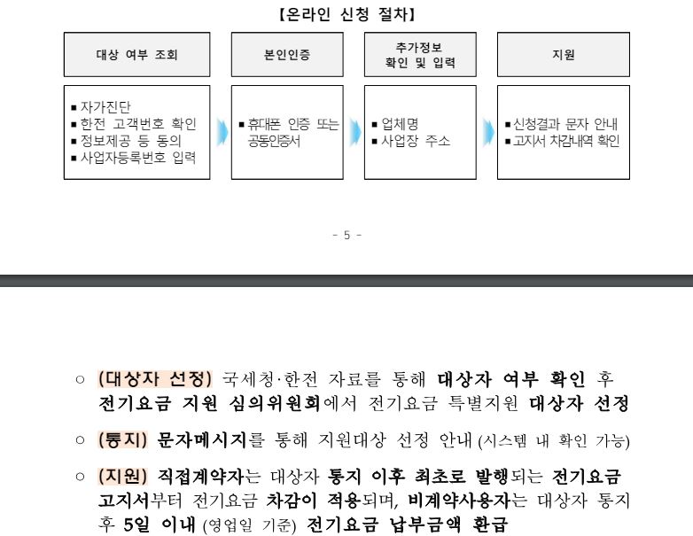 전기요금 지원절차는 구분 → 신청 → 검토 → 대상통보 → 요금 지원 순으로 진행됩니다. 신청방법은 "소상공인전기요금특별지원.kr에서 온라인으로 신청할 수 있다.
