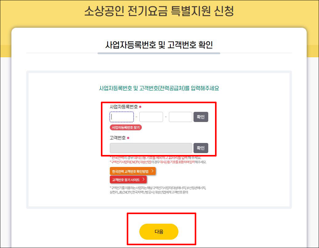 ⑤ 사업자등록번호 입력 및 고객번호 입력 → 다음