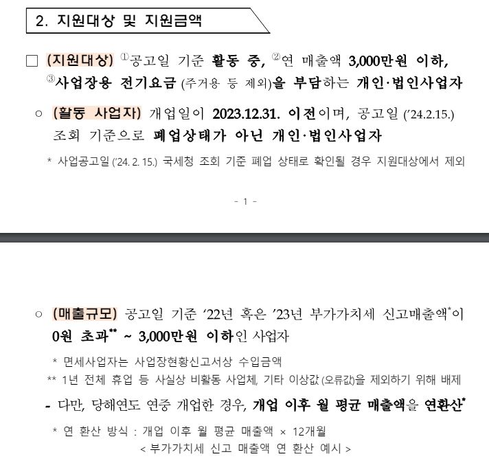 지원대상 : 공고일 기준 활동 중으로, 연 매출액 3,000만원 이하 / 사업장용 전기요금을 부담하는 개인이나 법인 사업자에 한함.