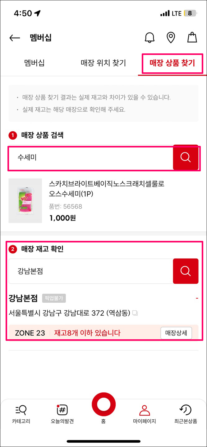 ⑤ 하단 <매장 재고 확인> → 근처 다이소 매장명을 입력 → 물품 재고 확인