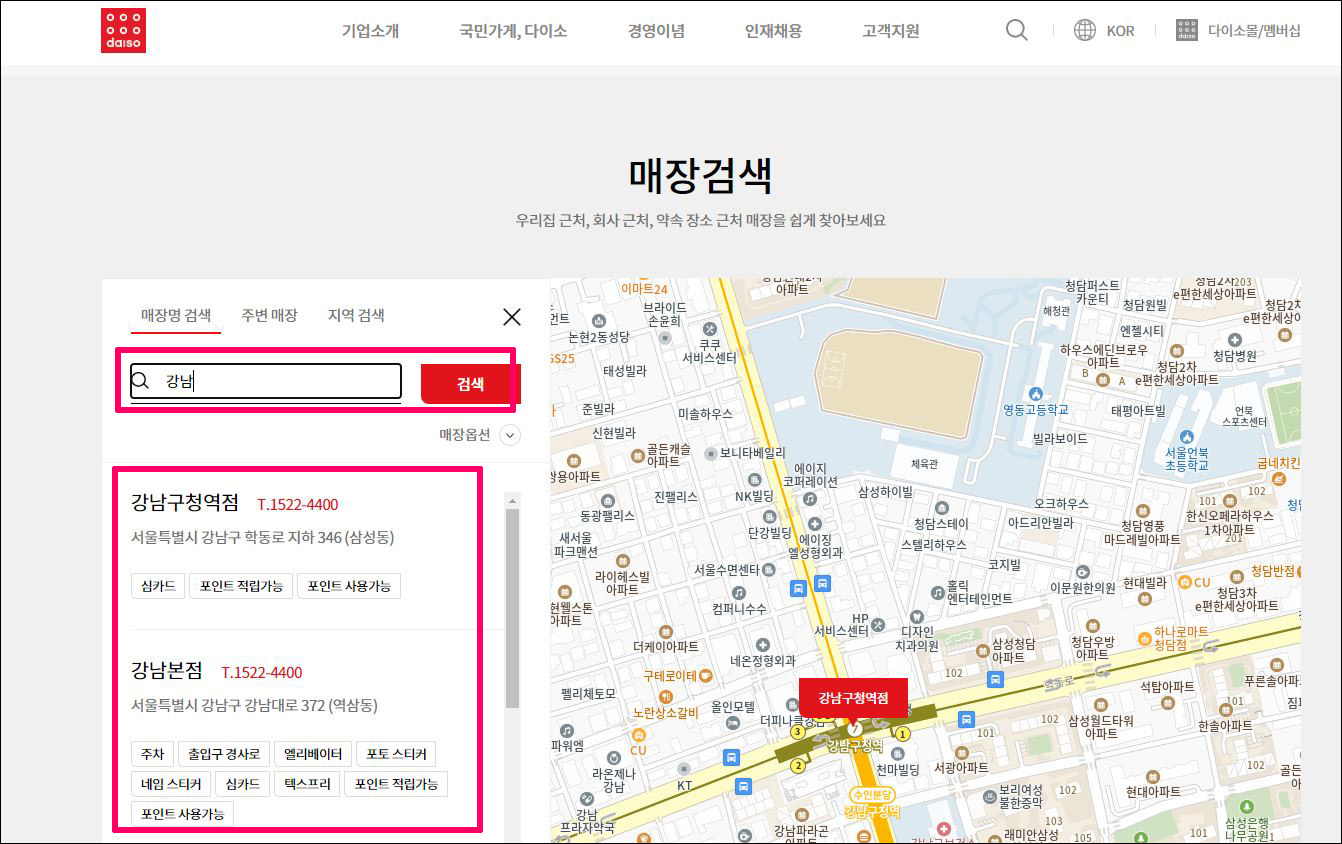 또는 다이소 공식 홈페이지 이용할 수 있습니다. 공식 홈페이지 접속 하여, ‘매장 찾기’ 또는 ‘매장 안내’를 클릭하면 주변 매장을 검색할 수 있습니다.