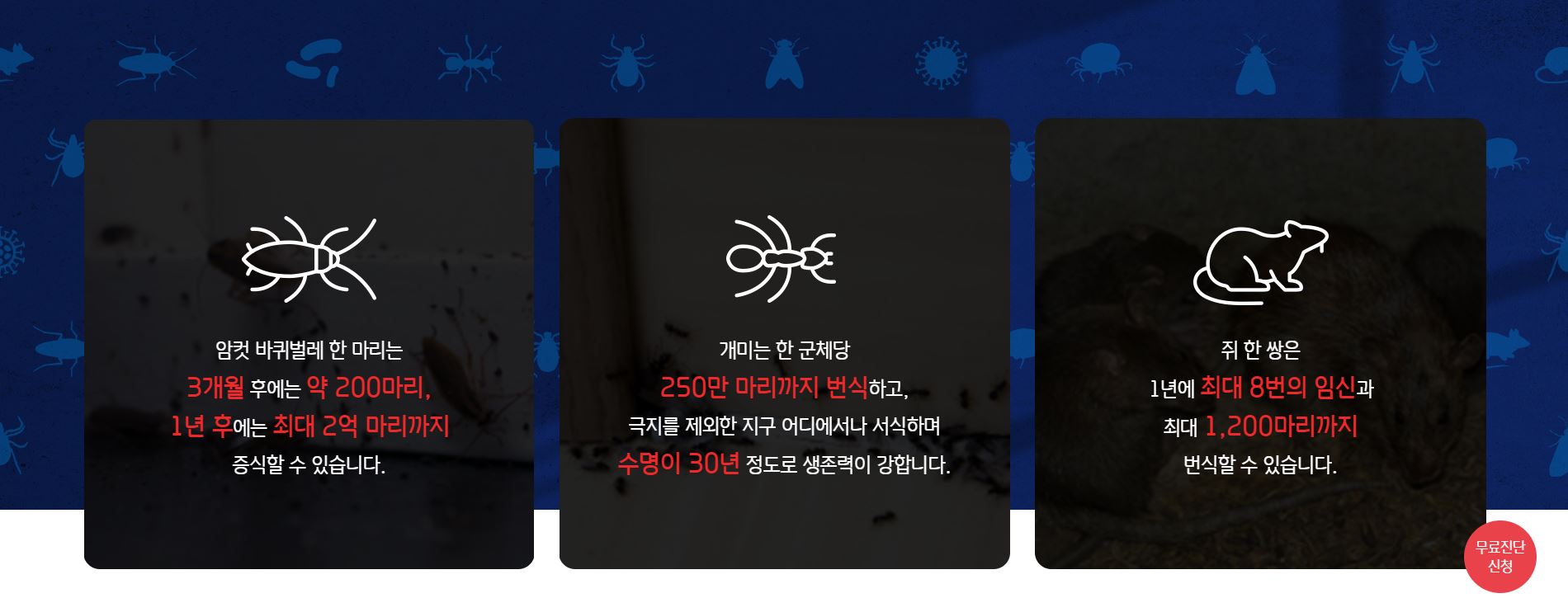 가정집, 비즈니스공간 등 문제의 해충을 발견했다면 이미, 수천에서 수만마리의 해충이 살고 있을 가능성을 의미합니다. 빈대, 바튀벌레, 거미는 물론 다양한 해충들을 세스코 통합 해충방제 설루션을 통해 해충의 근본적인 문제를 해결할 수 있습니다.