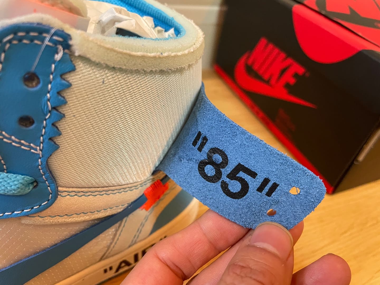 기존의 바디를 감싸는 갑피 부분은 위와같이 날개처럼 되어있으며 조던의 제작연도인 85의 숫자가 적혀있습니다. 그리고 설포와 바디의 마감은 재봉이 되지 않은 듯 잘린 형태로 스펀지가 그대로 노출되어 있는데, 이 또한 오프화이트 콜라보의 아이덴티티를 그대로 보여주고 있습니다.