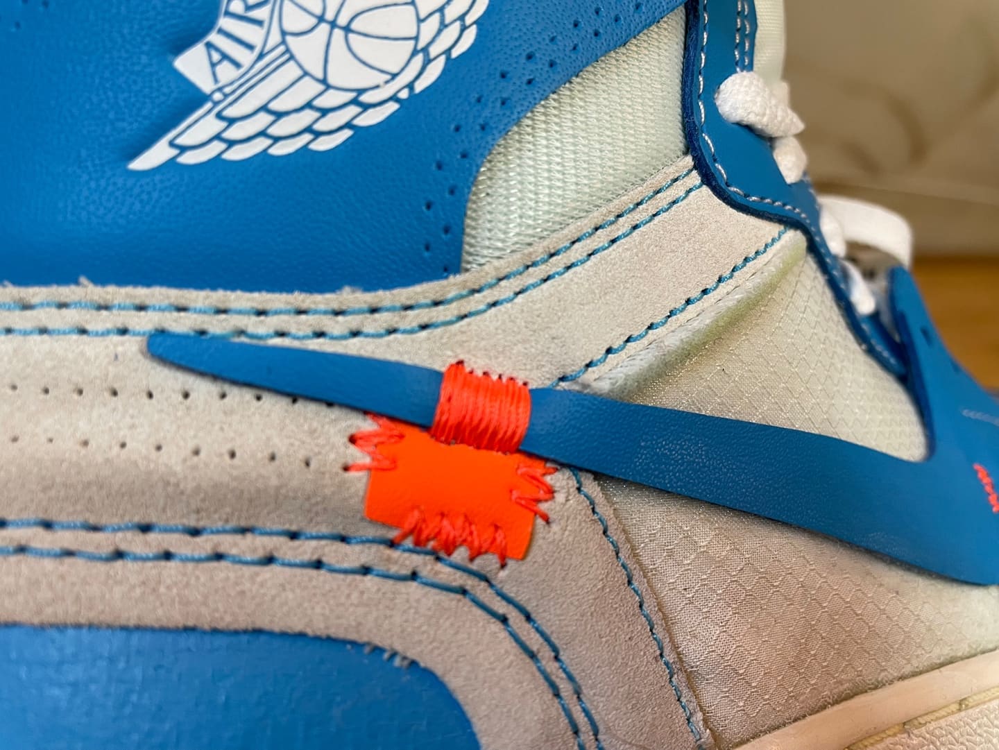오랜만에 꺼내 본 오프화이트 조던 1 UNC입니다. 영롱한 컬러가 눈을 사로잡습니다. 더텐은 버질아블로가 해체주의를 토대로 다시 해석하여 출시한 제품들인데요. 디자인은 정말 예쁘지만 내구성과 변색에 대한 우려는 항상 존재해 왔으며, 시간이 지난 후, 바디 부분이 조금씩 변색되는 것을 확인할 수 있습니다. 바디의 화이트 부분이 약간 노랗게 변색되기 시작하고 있습니다. 특히 나이키 스우시를 뜯어내 재봉한듯한 느낌의 디자인이 가장 큰 특징이라 할 수 있습니다. 하늘색 바디에 주황색의 재봉 포인트로 더욱 특별함을 더해줍니다.