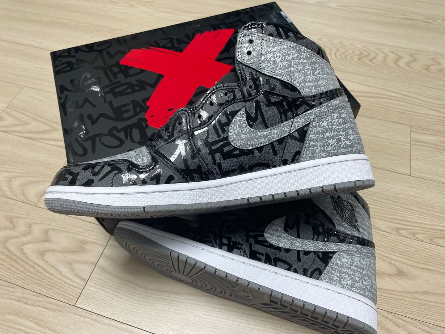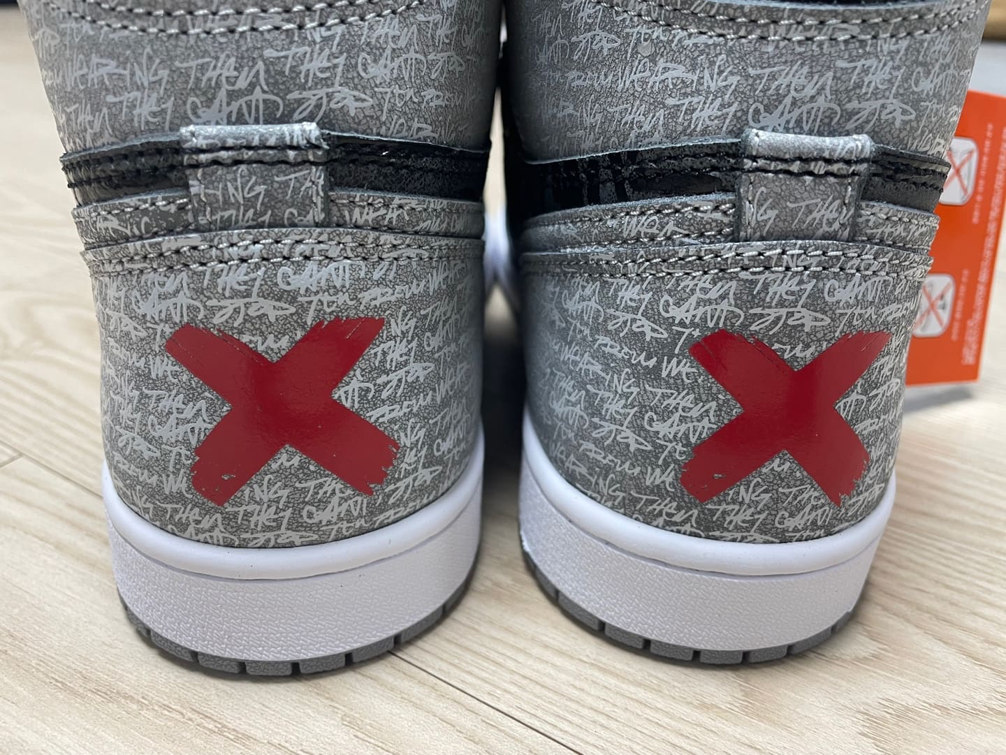기존의 조던 1과 다른 스페셜한 디자인의 박스입니다. 레드 컬러의 "X"가 굉장히 강렬하고 박스 전체의 "They Can't Stop You From Wearing Them"의 레터링이 전체를 수놓고 있습니다. "너희는 우리를 막을 수 없다"라는 뜻으로 NBA에서 에어조던을 착용한 것을 금지하던 Banned의 히스토리의 연장선인 모델이라 할 수 있습니다. "X"와 영문 폰트는 코팅되어 빛을 반사하고 있습니다.