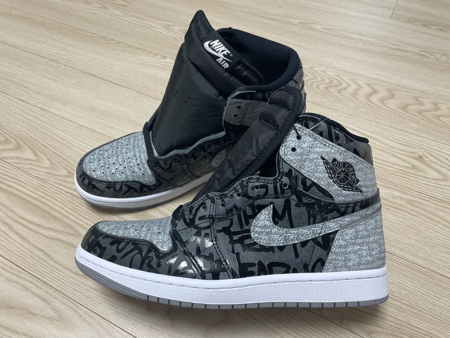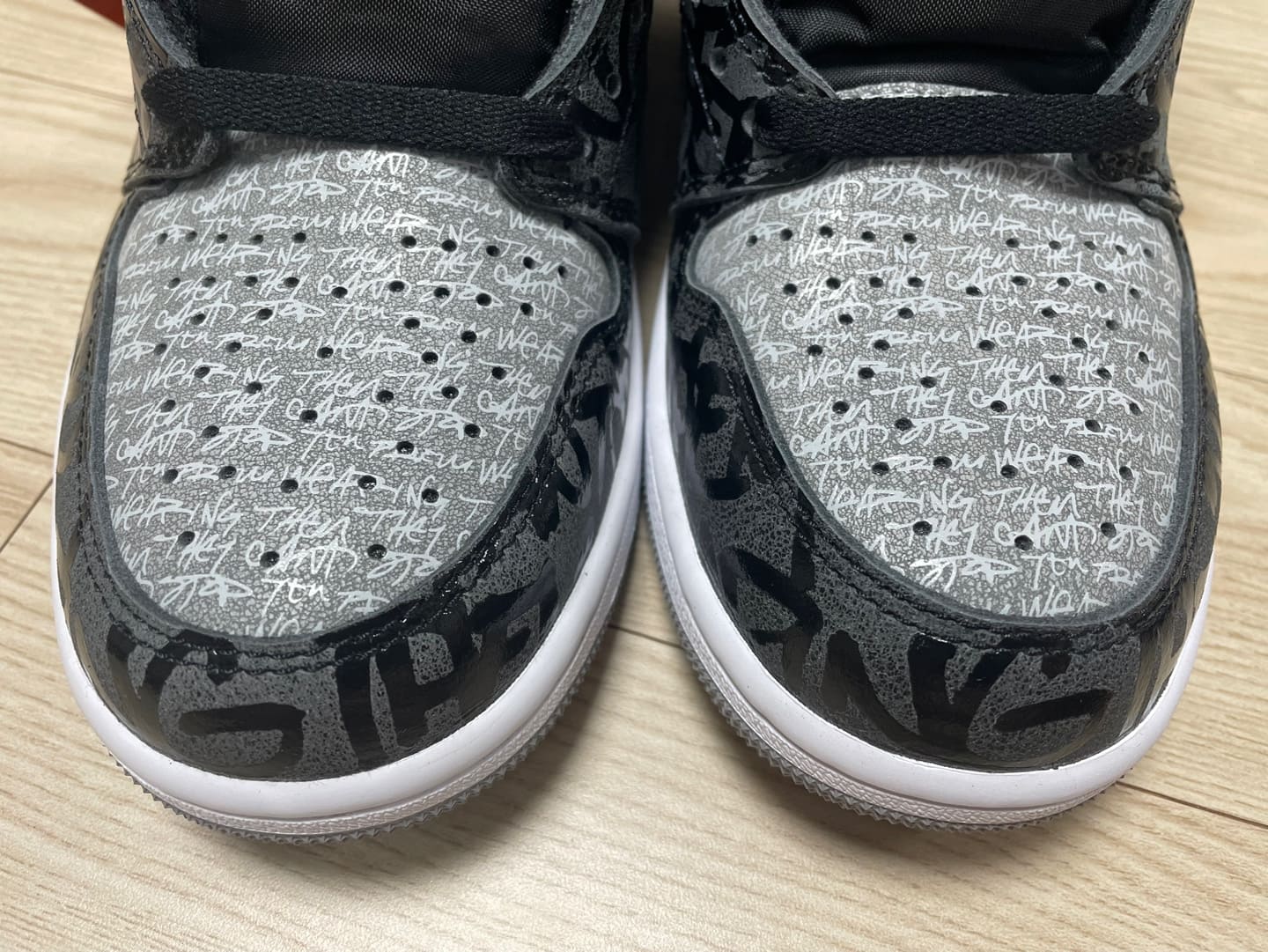 기본적으로 바디를 보시면 조던 1 쉐도우와 닮은 컬러웨이를 바탕으로 크고 작은 코팅된 폰트가 빼곡하게 새겨져 있습니다. 아마 신발 박스에 적혀 있던, "우리를 막을 수 없어"라는 저항적인 메시지의 레터링이 바디 전체적으로 채워져 있습니다.