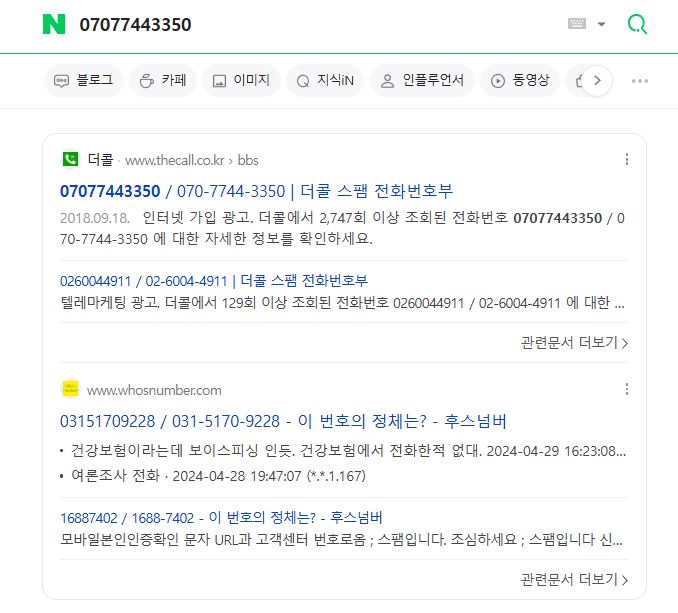 "더콜" 또는 "114on"을 통해 스팸 전화번호 또는 범죄에 사용된 전화번호를 구별하는데 도움이 될 수 있습니다. 검색창에 "더콜 스팸", "더콜 전화번호부"를 검색 후 원하시는 전화번호를 기입하시면 원하는 정보를 찾으실 수 있습니다.