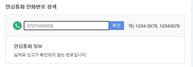 위의 "안심통화 전화번호 검색"에서 정보를 원하는 전화번호를 입력 후 "확인"을 누르시면 간단한 전화번호의 정보를 확인하실 수 있습니다.