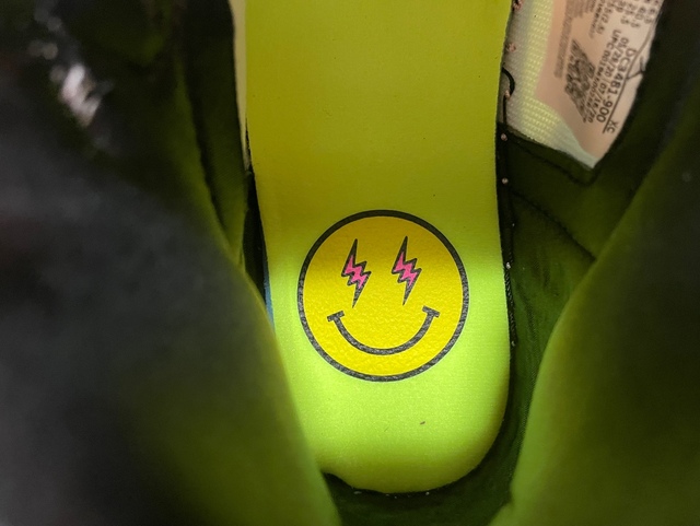 아웃솔은 연한 핑크 빛이 도는 컬러로 마감되어 있는데, 화려한 외피와 함께 아웃솔도 은은하지만 눈에 띄는 편이다. 인솔 또한 형광색 컬러와 스마일리 로고가 새겨져 있다. 굉장히 재미있는 제품이지만 실착의 한계가 여실히 느껴지는 제품이기에 리테일 가는 그다지 높지 않다.