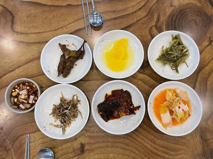 메뉴 선택 후 곧바로 기본찬들이 나온다. 물김치, 깻잎, 멸치, 미역 줄거리, 단무지, 고추 등이 정갈하게 나온다. 이후 부족한 찬들은 매장 한편에 셀프바로 기본찬들은 셀프로 가져다 먹을 수 있다.