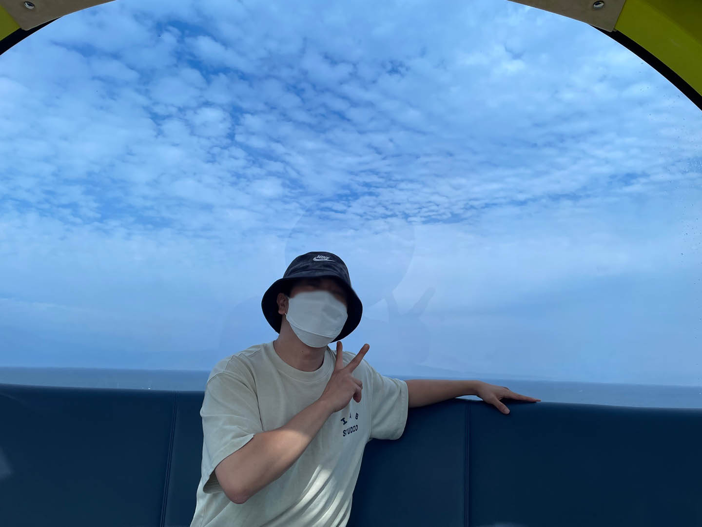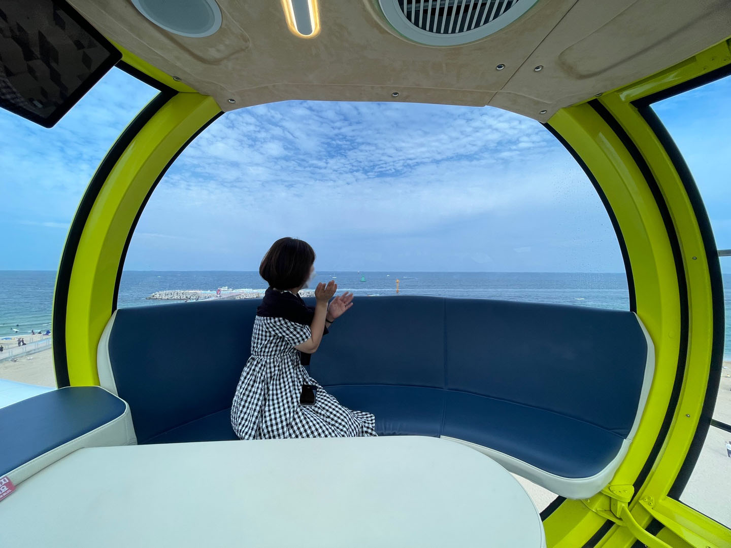 양옆으로 널찍하게 앉아 푸른 하늘과 바다를 배경으로 사진을 찍었다. 배경이 좋으니 막 찍어도 사진이 예쁘다. 아이들과 같이 타는 가족이라면 좋은 추억이 될 듯싶다. 에어컨도 시원하게 틀어져 있어 경치 좋은 카페에 온 듯한 느낌이다.