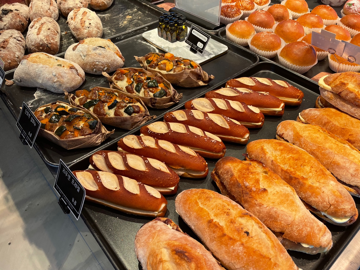 많지는 않지만 다양한 종류의 빵을 판매하고 있습니다. 마늘 식빵, 몽블랑, 찹쌀떡, 맘모스빵, 베이글, 소금빵, 깜빠뉴, 빨미까레 등 먹음직스러운 빵들이 있었습니다. 하지만 다소 가격이 높은 건 사실입니다. 요즘 빵 가격이 정말 무섭습니다.