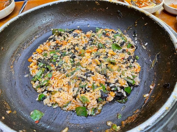 팬에 눌어붙은 꼬들꼬들한 밥알과 양념이 잘 배어 고소하고 짭조름한 맛이 일품입니다. 여기에 깍두기 김치 하나 올려 먹음 정말 맛있습니다.