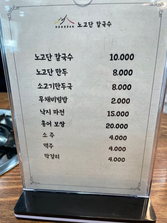 노고단 칼국수의 대표 메뉴는 "노고단 칼국수"입니다. 노고단 만두도 맛이좋아 항상 칼국수와 만두를 항상 시키곤 했습니다. 리뉴얼되고 만두국과 비빔밥, 낙지파전, 홍어 보쌈 등의 메뉴가 신규로 추가되었습니다. 가격은 예전하고 동일하네요. 일단 달라진 인테리어 만큼 훌륭한 맛을 보존하고 있을까요?