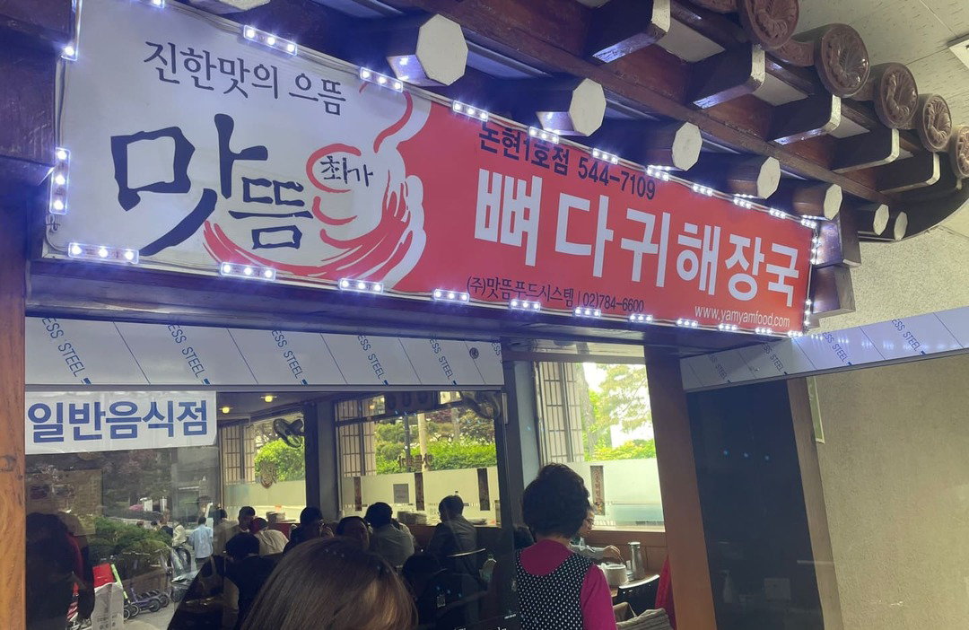 학동역 인근에 위치해 있지만, 가까운 거리는 아닙니다. 7호선 학동역 10번 출구로 나와 직진 후 논현 2동 파출소를 지난 후 좌회전하여 세븐일레븐 매점까지 직진해야 하는데 보행 시간으로 10분 정도 소요되는 듯싶습니다. <맛뜸 뼈다귀 해장국> 논현 1호점 앞모습입니다.