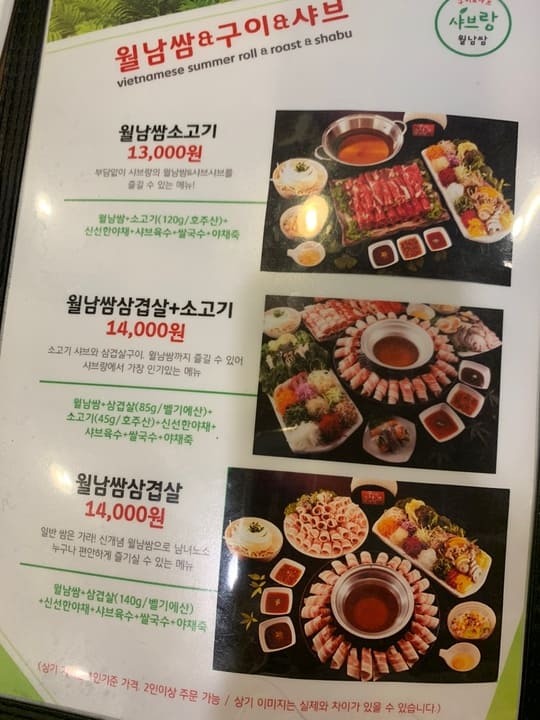 기본적으로 월남쌈과 샤브샤브를 함께하는 세트메뉴 형식입니다. 기호에 맞게 선택하시면 되지만 저는 월남쌈 삼겹살+소고기 메뉴를 가장 좋아합니다. 가격은 최근에 다소 변화가 있으니 참고만 하시길 바랍니다.