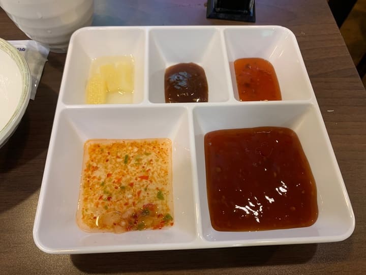 상콤한 파인애플과 다양한 소스들이 준비되어 있습니다. 저는 초딩학생 입맛이라 보통 칠리소스만 찍어먹습니다. 개인의 취향대로 찍어드시면 됩니다.