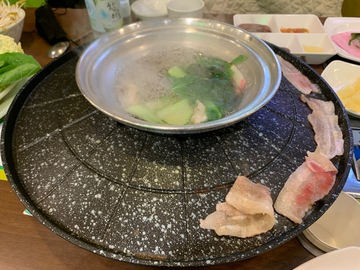 불판에는 삼겹살을 지글지글 굽고, 가운데는 샤브샤브 육수를 펄펄 끓여 먹어 손이 바쁘기도 합니다. 참 그리고 이곳 사장님 서비스가 너무 좋으셔서 단골이 되었습니다!