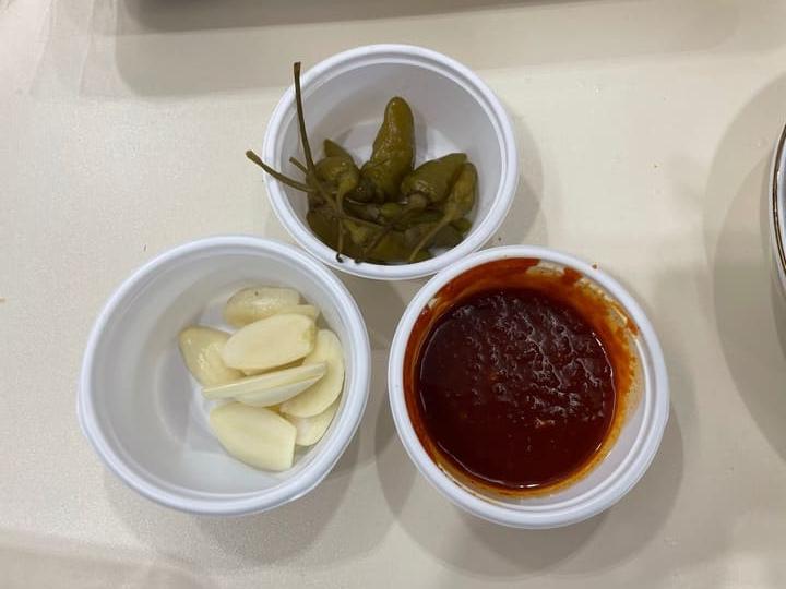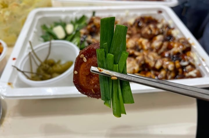 데리야끼막창, 불막창, 상추, 양념소스, 할라피뇨, 생마늘의 구성입니다. 주먹밥도 메뉴에 있긴 한데 집에 있는 밥으로 참기름 휙 두르고 통깨 솔솔 뿌려 김가루를 뿌려 조물조물 주물러 뚝딱 주먹밥을 만들었습니다. 계란찜도 맛있어서 포장주문을 하려 했는데, 계란찜은 포장이 안된다고 하네요.