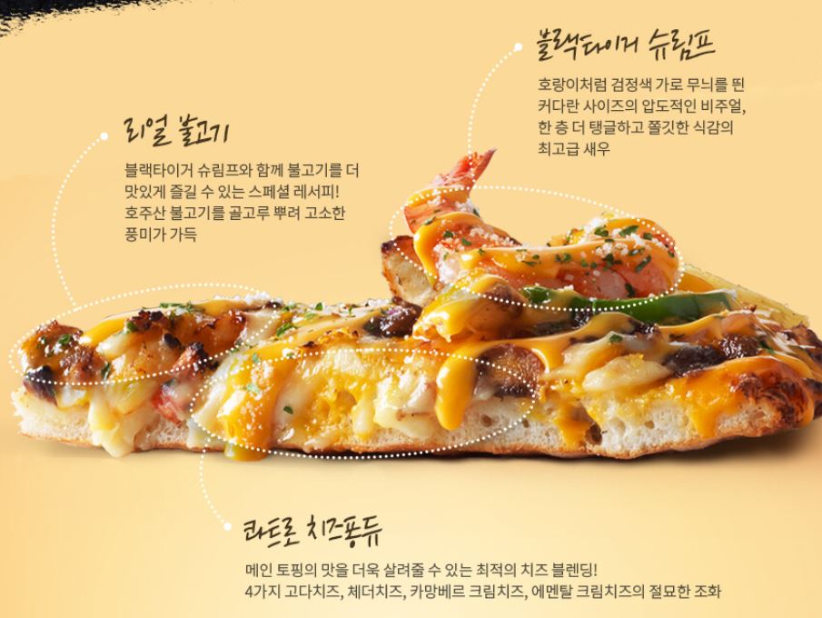바다와 육지의 풍미가 확 다가옵니다. 두툼한 도우와 함께 큼지막한 블랙타이거 새우가 눈에 띕니다. 호랑이의 무늬와 비슷하여 새겨진 이름이라 하는데요. 탱글하고 쫄깃한 식감이 아주 예술입니다. 호주산 불고기가 듬뿍듬뿍 뿌려져 고소한 풍미가 가득합니다.