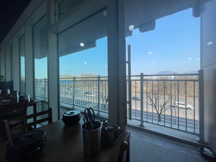 한강이 시원하게 보이는 창가에 앉았는데요. 이날은 늦은 점심시간 이후에 방문해서 여유롭게 착석이 가능했습니다. 좌석수도 많고 단체석도 많기 때문에 회식장소로도 매우 좋아 보입니다.