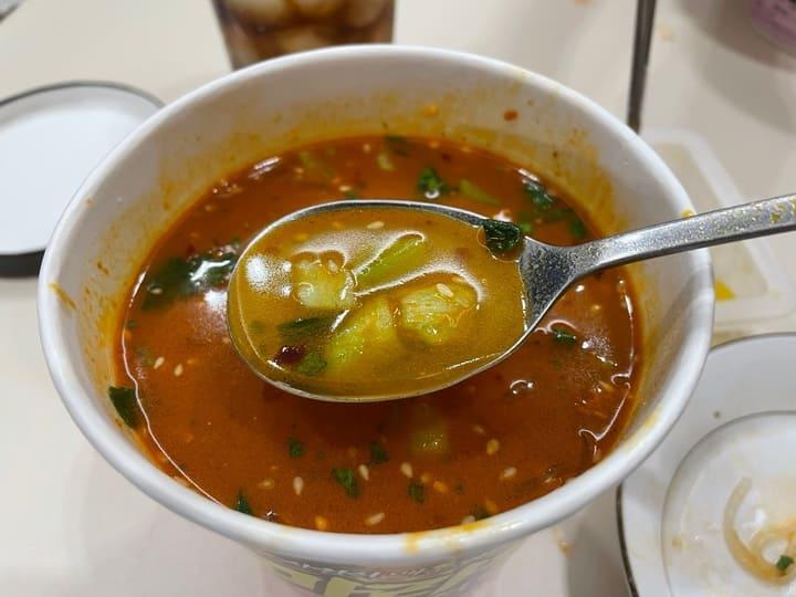 국물을 먼저 먹어보았는데, 매우 매콤하고 진한 마라향이 입안을 채워줍니다. 한국인의 입맛에 맞게 마라가 약하게 들어간 음식점들이 많은데, 정말 진한 마라향을 제대로 구현했습니다. 건더기 야채도 푸짐해서 더욱 좋았습니다.