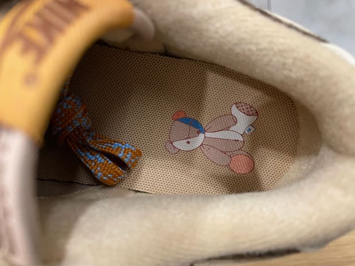 이제 디테일을 살펴보겠습니다. 사이드 나이키 스우시에 테디베어의 봉제가 떠오르는 나이키 로고 탭이 부착되어 있습니다. 스우시와 힐텝은 동일하게 부드러운 연한 베이지 컬러의 스웨이드가 적용되었습니다. 스우시에 붙은 XXX 봉제선은 인형의 봉제선을 표현한 것이 아닐까 하는 개인적인 생각입니다.