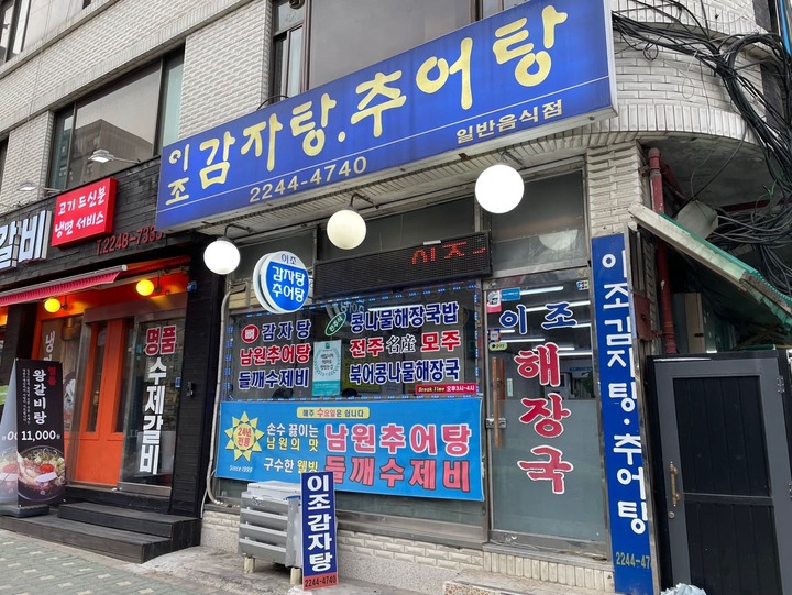 이조 감자탕추어탕 음식점입니다. 위치는 삼육서울병원 정문 맞은편에 위치하고 있으며 휘경동 웨딩헤너스 예식장 근처에 자리 잡고 있습니다. 장인어른의 오래된 단골 맛집으로 추천받고 장모님과 함께 점심을 먹으러 왔습니다. 주차공간이 특별히 없기 때문에 인근 공용주차장을 애용하셔야 합니다.
