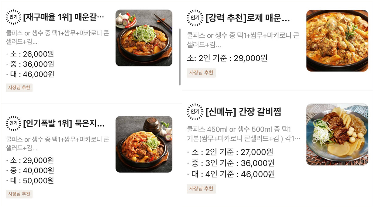 <재구매율 1위>라는 매운갈비찜으로 주문해 봅니다. 가격은 소가 26,000원. 중이 36,000원, 대가 46,000원입니다.
