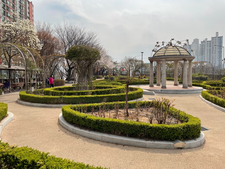 예쁘게 꾸며놓은 정원 갖은 느낌의 산책로와 각종 운동기구, 싱그러운 자연과 함께 걷다 보면 사람구경, 자연구경, 강아지 구경 등 심신이 편해지고 힐링되는 공간이기도 합니다.