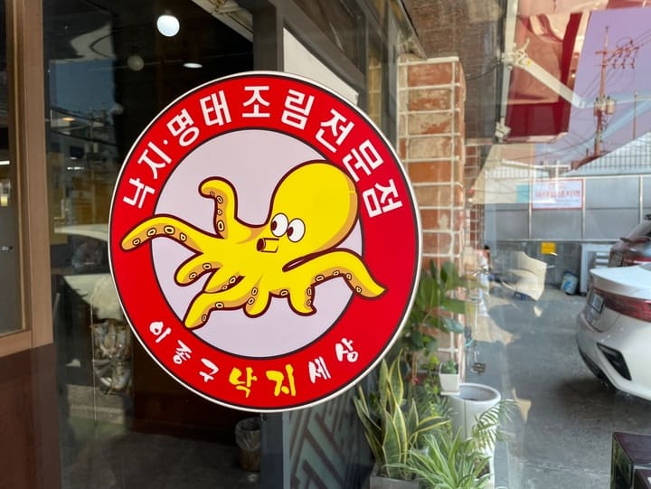 입구에는 귀여운 문어캐릭터가 손님을 반깁니다. 낙지·명태 조림 전문점 <이종구 낙지세상>입니다.