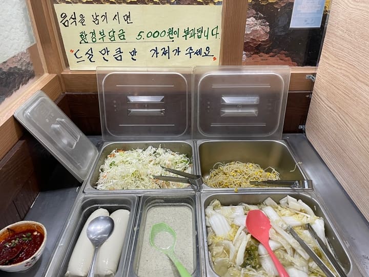 음식을 주문하면 샐러드와 연두부, 콩나물, 백김치, 고사리, 김 등의 반찬이 나옵니다. 매장 한편에는 셀프바가 있어 모자란 반찬은 셀프로 챙겨드실 수 있습니다. 적당히 남기지 않을 만큼만 담아갑니다. 백김치가 개운하고 시원해서 맛있더라고요.