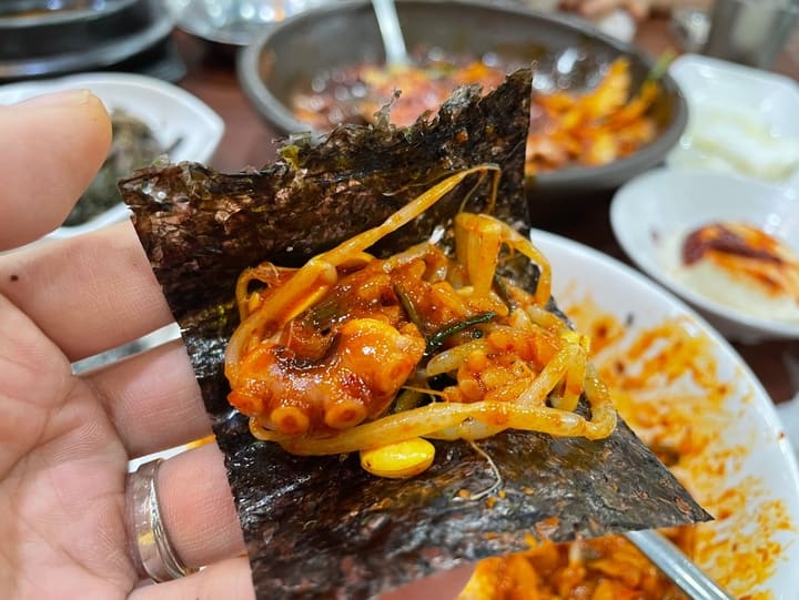 낙지를 덜어 밥에 쓱쓱 비벼주고 콩나물과 고사리를 넣어 섞어 줍니다. 오동통 실한 낙지가 식감이 매우 좋습니다. 알싸하게 매콤한 양념 또한 정말 최고입니다. 양념이 맵다면 콩나물과 나물을 더 섞어서 비벼 드시면 매운맛이 적어지므로 적당히 맛을 보며 비벼먹습니다.