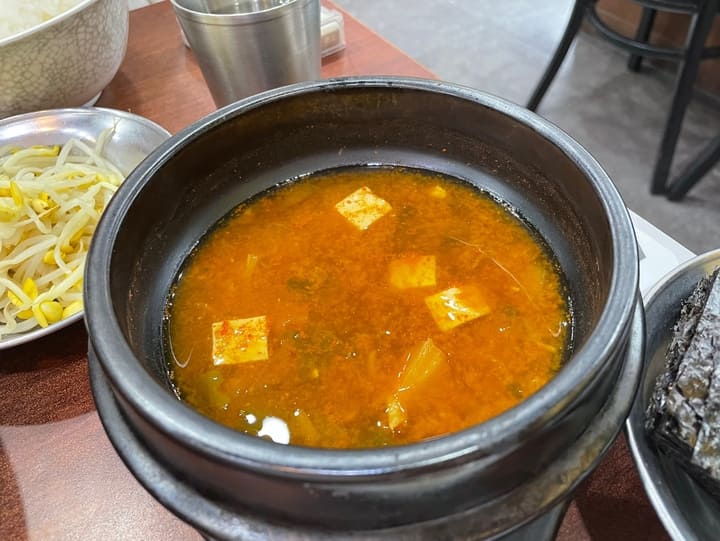 그리고 한국인의 밥상에서 빠질 수 없는 된장국이 나옵니다. 된장국과 된장찌개의 중간정도로 보시면 좋습니다. 백김치도 깔끔하고 시원한 맛이 일품입니다. 물론 식감도 최고지요