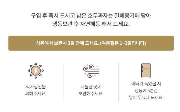 그날 다 드시지 못하시고 남은 호두과자는 보통 더운 여름에는 1일~2일 정도, 겨울철에는 3~4일 정도 직사광선을 피해 서늘한 장소에 두면 보관이 가능합니다. 이후 남은 호두과자는 밀폐용기에 넣어 냉동보관하신 후 전자레인지가 아닌 자연해동하여 드시길 바랍니다.