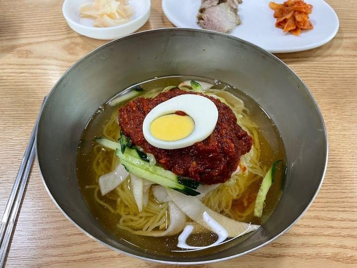 주문한 물밀면과 양념밀면이 나왔습니다. 매콤하고 달콤한 소스와 함께 계란이 올라가 있고요. 역시 냉면과 같게 다른 점은 육수의 유무라 할 수 있습니다. 특히 매콤한 다진 양념 소스가 너무 맛있더라고요.
