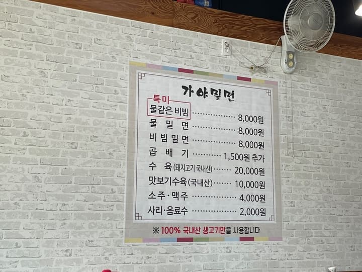가야밀면의 메뉴입니다. 메인인 물같은 비빔, 물밀면, 비빔밀면이 8,000원이고 1,500원만 추가하면 곱배기양을 드실 수 있습니다. 밀면은 또 수육과 함께 먹는 것으로도 유명한데, 수육도 따로 시킬 수 있고 맛보기용 수육도 주문이 가능합니다.