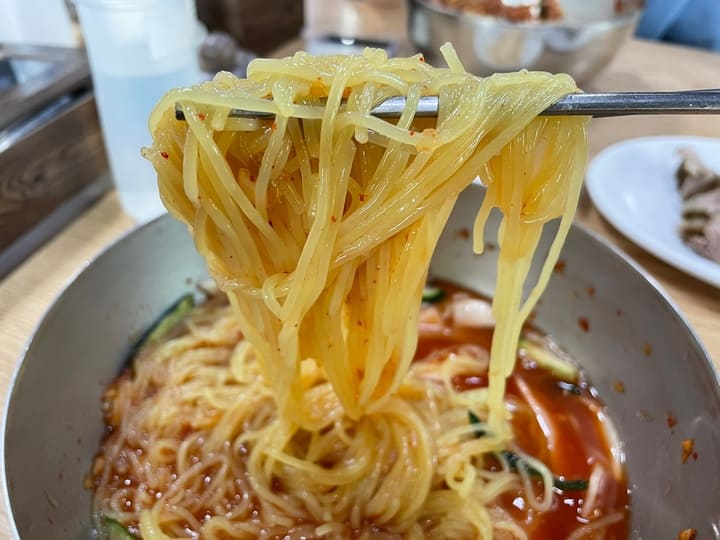 촉촉한 수육 한 점과 밀면을 함께 먹어주면 시원하고 담백한 맛이 일품입니다. 이곳은 오리지널 밀면의 맛을 이어오고 있습니다. 요새는 워낙 다양한 형태의 밀면 요리가 많은지라 가끔 이런 오리지널 밀면 맛이 그립거든요. 매콤하지만 담백하고 깔끔한 육수가 좋았습니다.