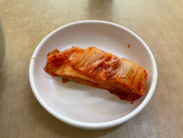 반찬은 별다를 것 없는 잘익은 배추김치입니다. 직접 담그신 딱 약간의 신맛이 날 정도의 김치인데 국수와 먹음 정말 최고의 조합입니다. 김치나 면도 조금씩 추가로 주시기도 하시니 모자라시면 요청하시면 됩니다.