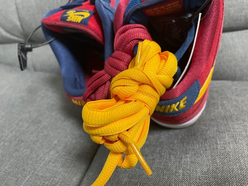 슈레이스의 구성은 기본적으로 네이비 컬러의 슈레이스가 달려있고, 바디의 컬러 웨이인 레드, 옐로우 계열의 슈레이스가 동봉되어 있고, 보시다시피 우동끈으로 되어 있습니다. 이렇게 나이키 SB 덩크로우 바르셀로나 모델을 살펴보았습니다.