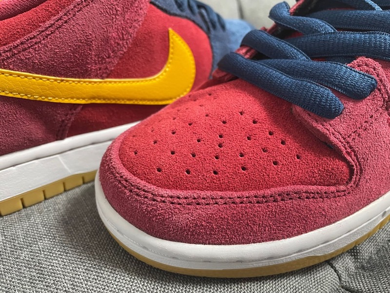 밑창은 바닐라 색상의 고무창(검솔)으로 되어있고, 중심에는 나이키 SB로고가 음각으로 새겨져 있습니다. 바디의 토 부분을 보시면 스웨이드로 이루어져 있지만, 코부분과 코를 감싸는 토부분이 레드 계열로 되어있지만 미세한 색상의 차이를 볼 수가 있습니다. 토부분이 좀 더 진한 레드라고 볼 수 있습니다. 또한 나이키의 스우시는 스웨이드가 아닌 옐로우톤의 매끈한 가죽으로 제작되었습니다.
