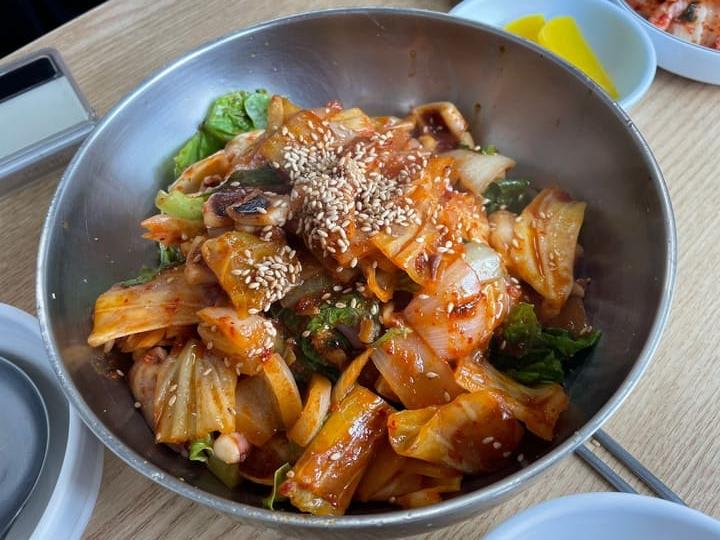 정말 푸짐한 양의 오징어덮밥입니다. 정말 집에서 어머니가 해주시는 손맛 그대로입니다. 달달하지만 짭짤한 양념과 양껏 넣어주신 채소가 아삭한 식감을 자랑합니다.