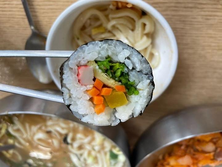 정말 정말 배부르지만 또 이곳에 오면 꼭 먹어야 하는 김밥을 한 줄 주문합니다. 가격이 착하기 때문에 정말 많은 분들이 포장을 하시는데요. 인근 회사에서도 점심때 많이 주문하시더라고요. 기본 야채 김밥을 베이스로 밥알도 많고 채소 양도 적당하니 좋습니다.