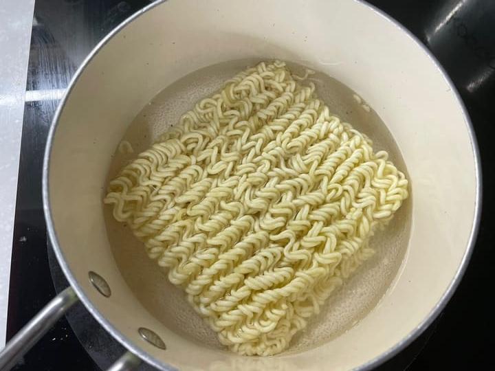 ① 일단 물이 팔팔 끓여지면 라면사리를 넣어 4분간 더 끓여줍니다.