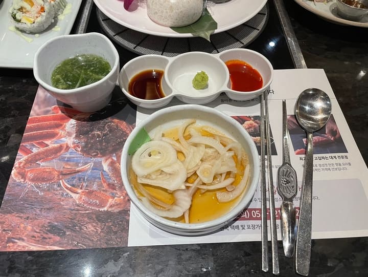 대게를 주문하고 찌는 동안 간단한 상차림 메뉴가 나옵니다. 1인당 상차림비용 7,000원이 추가됩니다. 7,000원의 상차림에는 양파장, 버섯게살수프, 샐러드, 초무침, 유린기, 한우육회, 생선회, 후식 등이 조금씩 차려집니다.