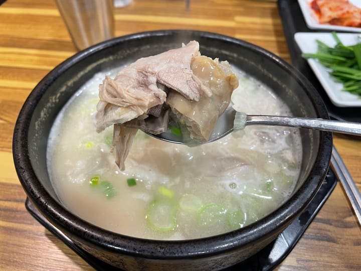어디서 비슷한 느낌의 육수를 먹어보았다고 생각했는데 돈코츠 라멘의 진한 국물맛과 비슷합니다.