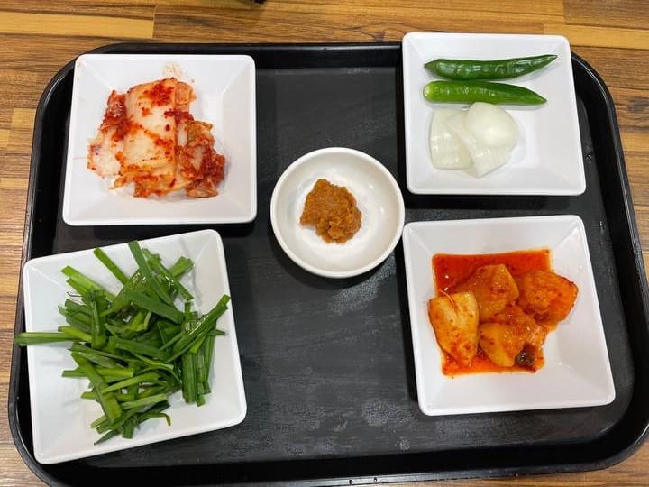 주문과 동시에 간결한 밑반찬이 나옵니다. 배추김치와, 깍두기, 양파와, 고추, 부추, 쌈장이 차려지는데, 특히 깍두기가 정말 새콤하니 맛이 좋더라구요.